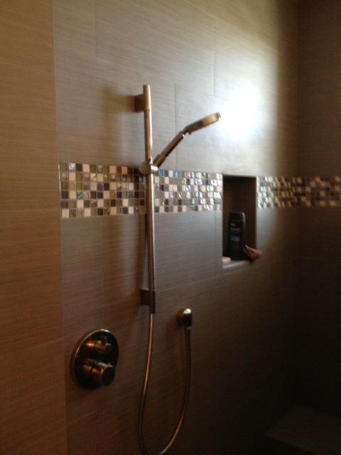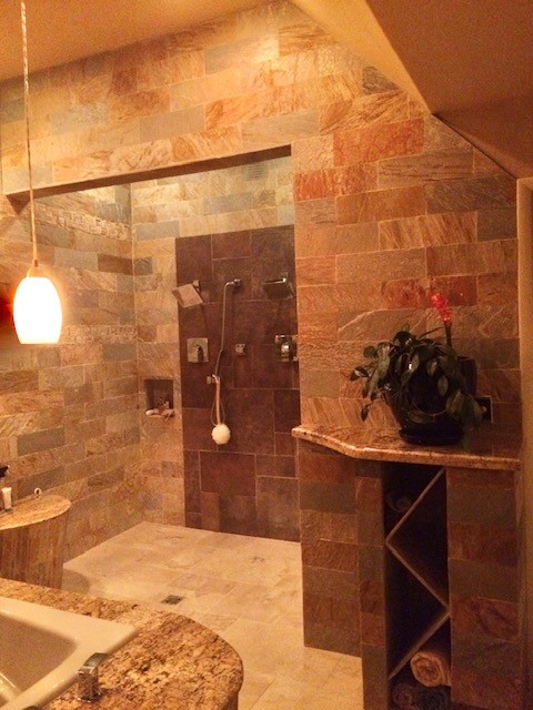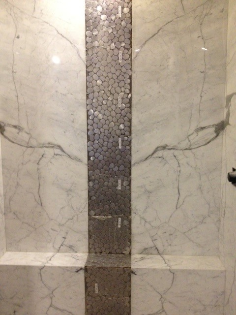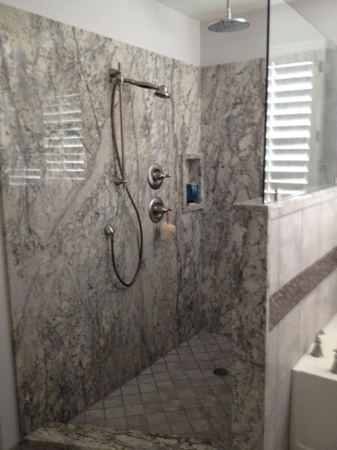 • Quartz and granite slab showers for a sleek, modern appearance.